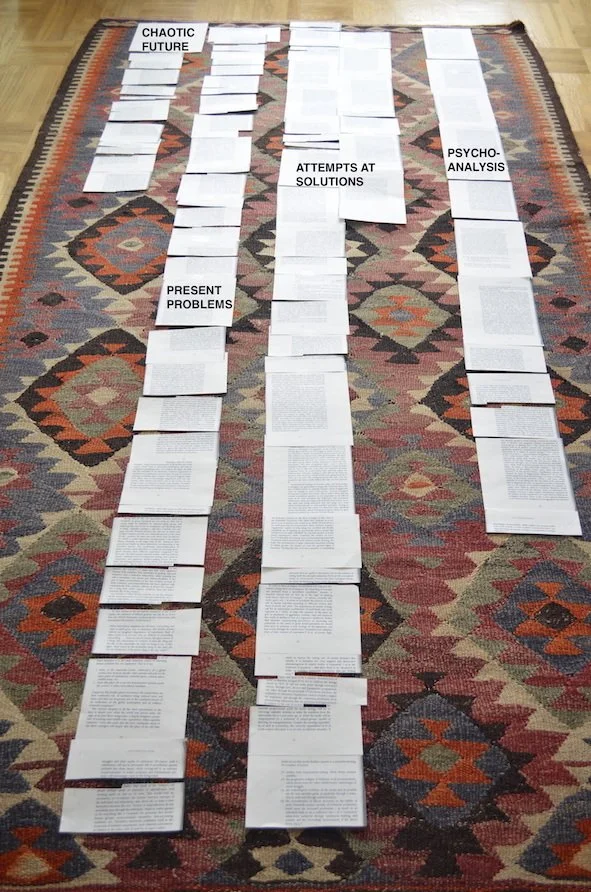 When I read The Three Ecologies by Félix Guattari for the first time, I was struck by the depressive and pessimistic view of our society, which seemed to predict that everything was going to hell. Reading the text decades after it was written, it seemed that no solutions have been found, and if anything the problems have gotten worse. Guattari’s rampant writing style adds to the breathlessness with which I read. I got the impression that I could deal with his ideas better if I could cut out his rage, which is why I started rearranging The Three Ecologies. I cut as I read and piled up snippets of text in the categories: predictions of a chaotic future, descriptions of present problems, attempts at solutions, psychoanalysis. My attempt is not to analyse the concepts of The Three Ecologies but to be able to enter the text in the first place. As the text turned into little pieces, I realised how many ideas for solutions he offers, but they had drowned in the negative chaos when I read the first time. In fact, the pile with attempts at solutions is the biggest.